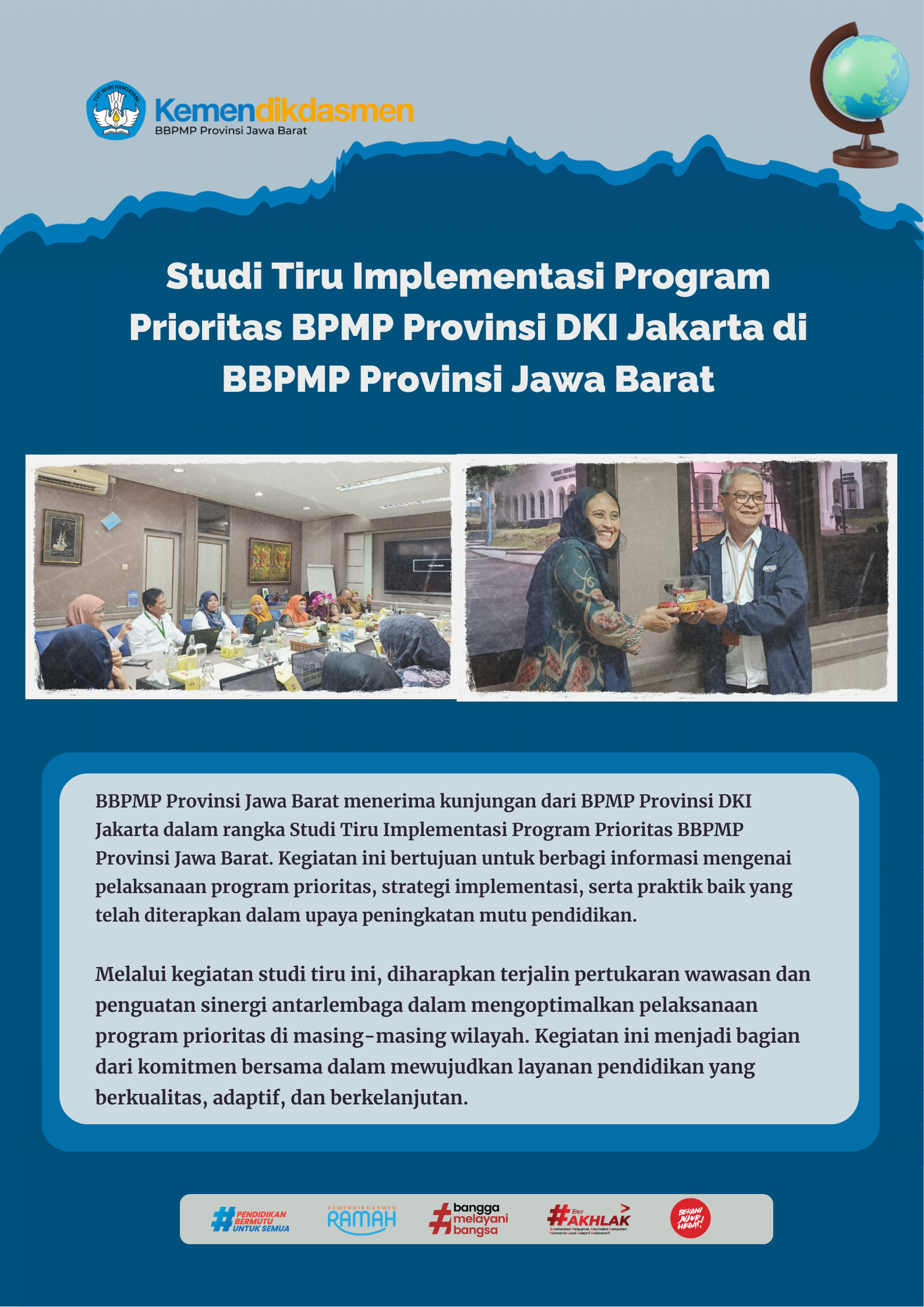 BBPMP Provinsi Jawa Barat memerima kunjungan Studi Tiru Implementasi Program Prioritas dari Asosiasi Widyaprada Indonesia Pengda DKI Jakarta – BPMP Provinsi DKI Jakarta pada Senin, 22 Desember 2025. Kegiatan ini menjadi bagian dari upaya bersama dalam mendukung peningkatan mutu pendidikan serta penguatan pelaksanaan berbagai program prioritas pendidikan nasional.