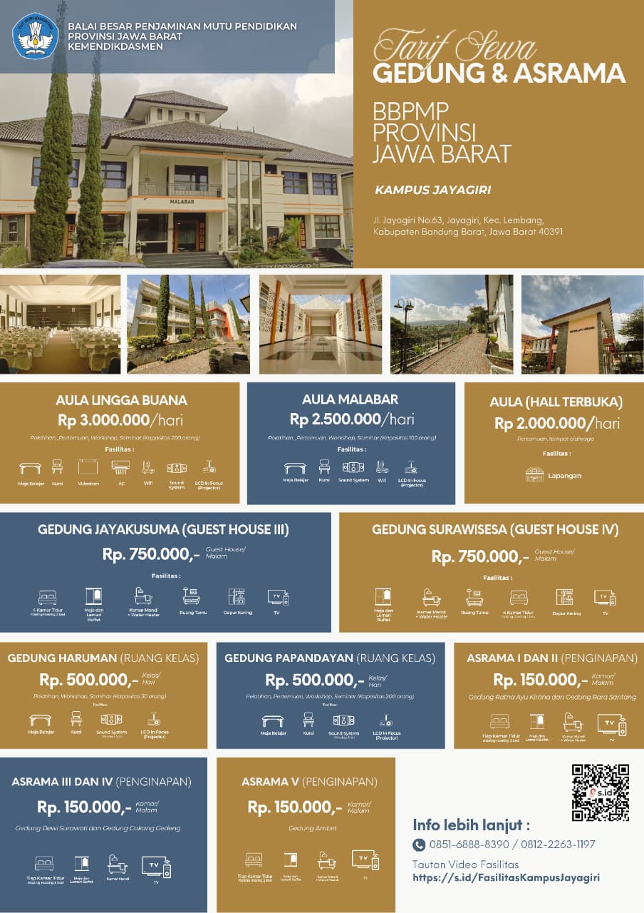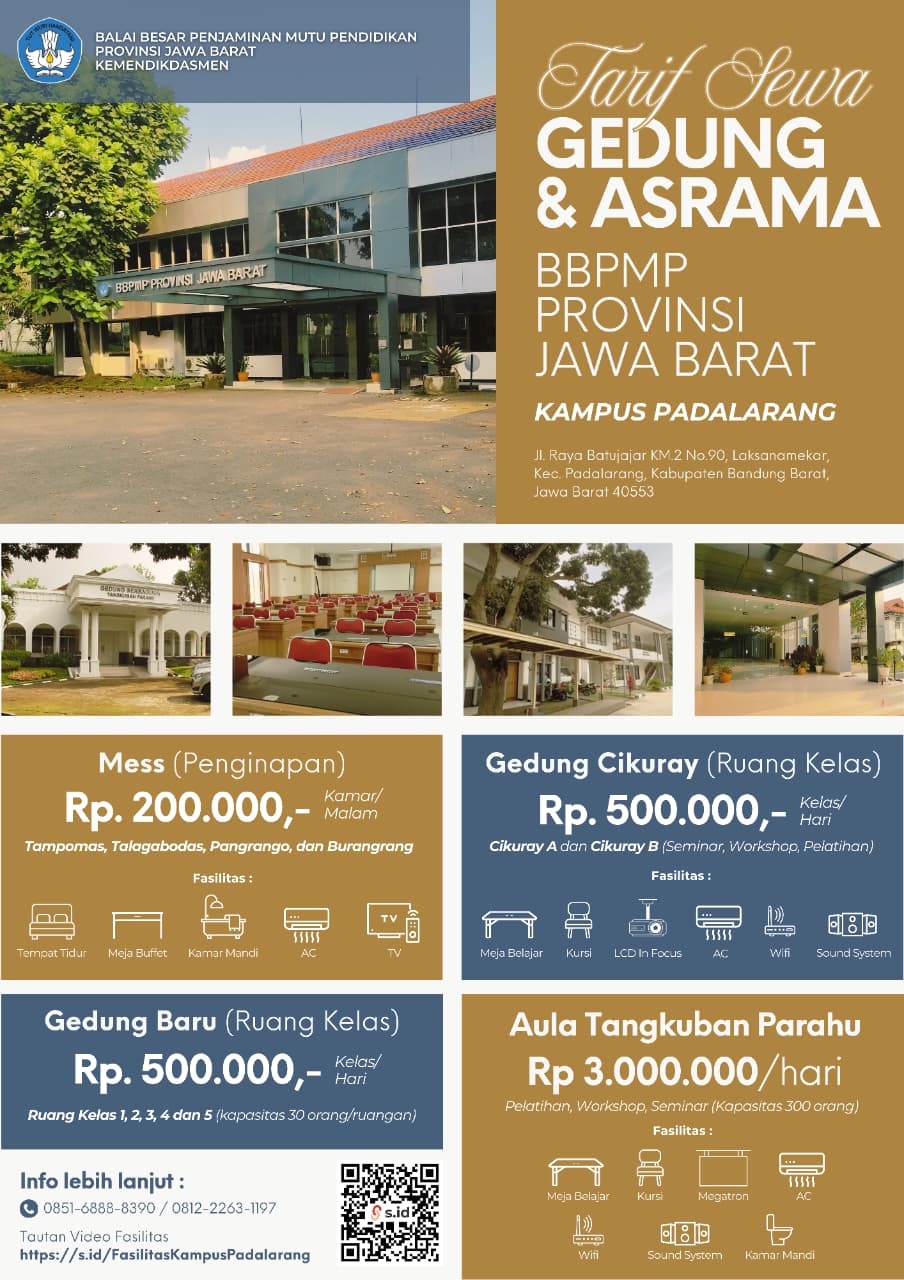 BBPMP Provinsi Jawa Barat menyediakan beragam fasilitas di Kampus Padalarang dan Kampus Jayagiri yang dapat disewa untuk mendukung aktivitas pendidikan, pelatihan, maupun pertemuan instansi.